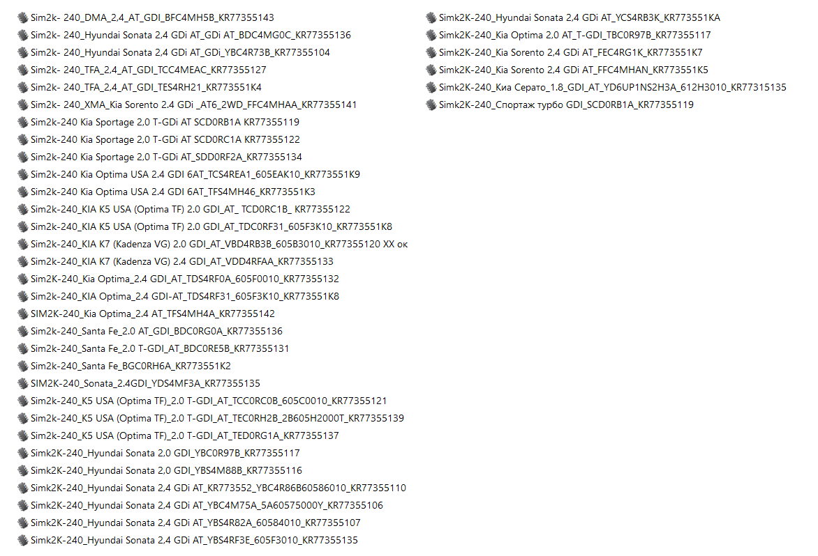 Модуль SIM2K-240 для редактирования FLASH размером 2Мб корейских автомобилей. Данные ЭБУ устанавливаются например, на Hyundai Sonata 2,4 GDi AT, К5 USA (Optima TF)_2.0 T-GDI_АТ, KIA K7 (Kadenza VG) 2.0 GDI_AT и др. с двигателем GDI. В настоящий момент поддерживается 32 софта. Модуль работает с софтами любого рынка. КС считается загрузчиками.