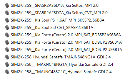 Ищутся стоки для модуля SIM2K-258/259 для редактирования FLASH размером 2560 кВ корейских автомобилей. Список поддерживаемых софтов и модели авто на скрине. В настоящий момент имеются всего 3 карты калибровок. Если наберется хотя бы 10-12 софтов, модуль сделаю и выпущу. Добавлять в модуль SIM2K-250/251 не буду, там и так много софтов. Будут стоки, будет и модуль SIM2K-258/259. Отдельными картами продажи не планируется.